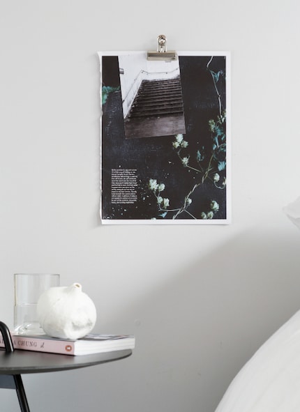 Les trombones sont sous-estimés. Elles ne sont pas seulement utiles au bureau. Je les utilise pour relier des cartes postales et d'autres papiers volants et les accrocher ensemble. Pour cette solution, choisissez deux formats, par exemple un format A4 et un format A6, et fixez les motifs au mur à l'aide d'une pince et d'un clou.