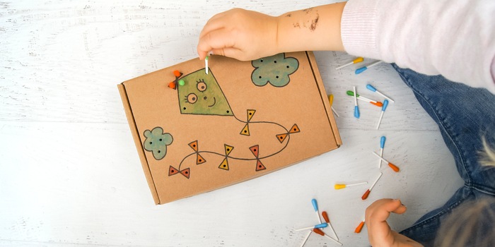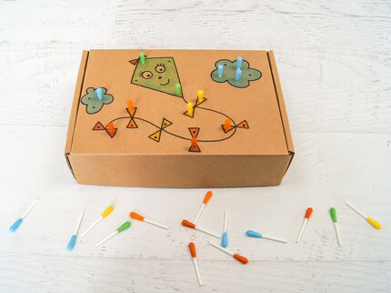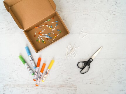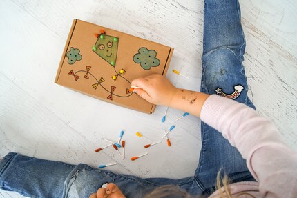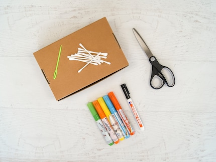 Pour réaliser le jeu d'encastrement, vous avez besoin d'une vieille boîte en carton, de feutres colorés et de cotons-tiges. Une paire de ciseaux et une aiguille sont également très utiles.