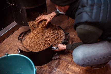 Roni, le torréfacteur d'Ebmatingen, vient d'atteindre la dernière étape. Il fait chaud dans la pièce et les parfums des différents mélanges de café emplissent l'air. Liri retire ce qui ressemble à des copeaux de bois d'un bac latéral du torréfacteur, semblable à une cheminée. « Juste à temps. Lors de la torréfaction, les fines peaux argentées des grains de café finissent ici. Sans vidange régulière, ils obstruent la cheminée et deviennent de plus en plus chauds jusqu'à ce qu'ils prennent feu et, dans le pire des cas, incendient toute la fabrique de torréfaction », lance-t-il avec une certaine exagération. Aujourd'hui, la quantité de ces pellicules est particulièrement élevée, car elles ont été torréfiées presque exclusivement avec des grains lavés. « Il existe plusieurs types de traitement. Le lavage n'est effectué que dans les régions aux abondantes ressources hydriques. Ce traitement n'enlève pas la peau argentée sur la plupart des grains, ce qui entraîne davantage de déchets organiques lors de la torréfaction. Avec l'autre méthode, à savoir le séchage, la plupart des pellicules se détachent au cours du processus. »