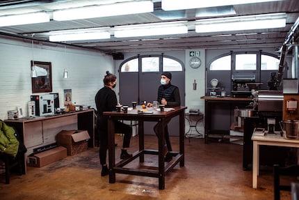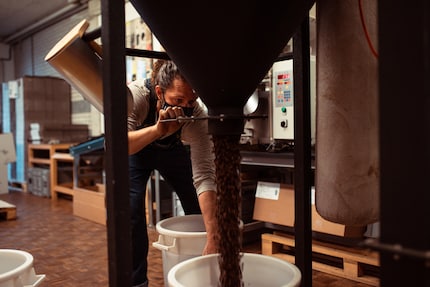 Tout afficherBlack & Blaze est le nom de la société responsable de ce parfum. Il ne s'agit pas d'une chocolaterie, mais d'un petit atelier de torréfaction du café. À l'intérieur flotte une odeur plus douce, mais visuellement, tout n'est que café en ces lieux : sacs de grains de café vert du monde entier, machines à café, moulins et café filtre fraîchement infusé. « C'est comme ça que je le préfère », lance Liri, employé de longue date et partenaire de Claude. « Il est doux, accentué par des acides de fruits et, surtout, d'une grande complexité gustative. À ne pas confondre avec le café filtre que grand-mère faisait couler. » Un travail minutieux et de nombreuses tentatives de torréfaction ratées se cachent derrière ces grains de café.