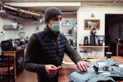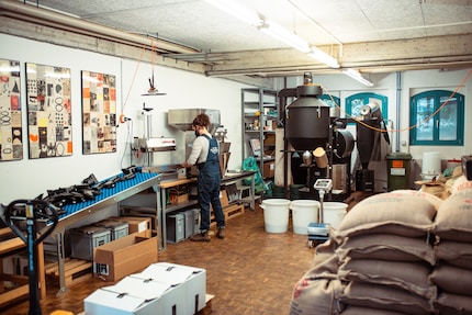 Ce contact direct avec les cultivateurs est important pour le commerce équitable et revêt une valeur personnelle. « Chaque année, un membre de l'équipe visite l'une des fermes partenaires. Pour les deux parties, ce contact est instructif et magnifique », déclare Liri. « Nous voyons comment les cultivateurs travaillent, l'aide qu'ils reçoivent de la famille, la fierté qu'ils éprouvent envers leur produit. Ils ont le sentiment d'être pris au sérieux et voient où leurs récoltes atterrissent. » Roni emballe le café dans des sachets noirs de 250 g. « Je fais ça entre deux. Mais j'utilise une minuterie pour ne pas rater une étape de la torréfaction. » Les sachets, conditionnés au départ dans des cartons reposant sur une construction en bois maison, voyagent sur un long convoyeur bleu au-dessus duquel trône une trilogie de collages bigarrés. C'est un peu la touche personnelle dans cette salle de torréfaction.