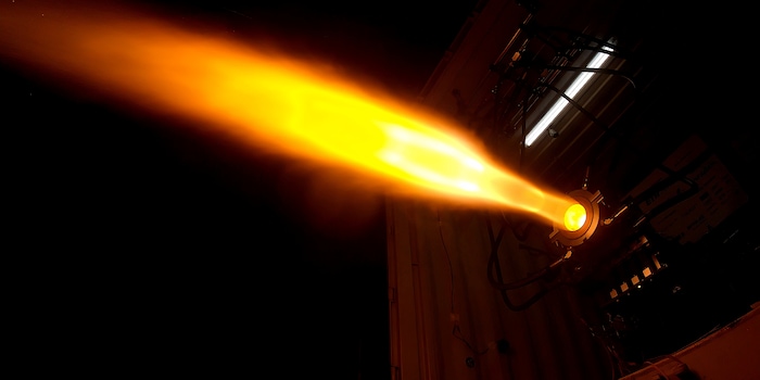 Le moteur est rempli de carburant solide pour la première fois, fixé sur le banc d'essai et connecté au réservoir. Le puissant système de refroidissement par eau attire tous les regards.