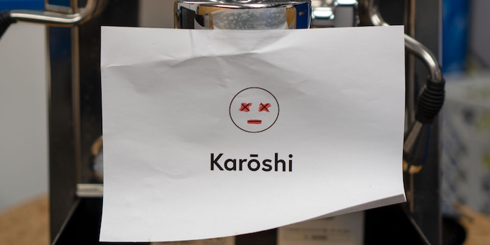 "Karoshi" est écrit sur la fiche de notre vieille machine Bezzera : "mort par excès de travail" en japonais. La machine à café a rendu l'âme et a poussé nos graphistes au bord de la folie. J'essaie d'aider.