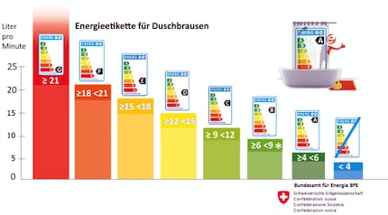 Comme vous pouvez le voir sur la représentation des classes pour l'étiquette énergétique ci-dessus, il existe également une catégorie qui est meilleure que la « A », mais qui n'a pas reçu sa propre lettre. Ce sont des pommeaux dont le débit est inférieur à quatre litres par minute. L'autorité responsable de la classification SuisseEnergie ne classifie toutefois pas les douchettes de ce type, la meilleure classe étant « A ».