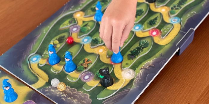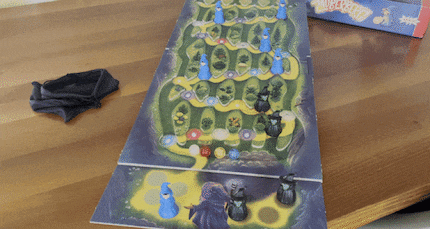 Le but du jeu est que quatre apprentis sorciers atteignent le magicien Balduin avant que trois sorcières n'y parviennent. Cependant, nous n'avons pas lu cela dans les instructions : Nous sommes partis aveuglément du principe que nous ne gagnerions que lorsque les six apprentis sorciers auraient atteint l'objectif avant les sorcières. Ce n'est pas grave, le principe est le même.