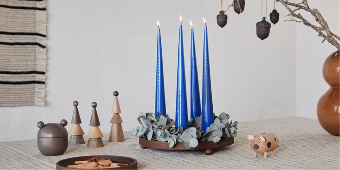 Le changement de tapisserie est aux murs ce que le changement de plantes est à la couronne de l’avent. Oyoy opte cette année pour le vert léger de l’eucalyptus plutôt que celui foncé du sapin. Les branches d’eucalyptus sont parfaites pour façonner sa propre couronne scandinave. Vous pouvez soit les prendre individuellement soit les couper à un arbre. Pour une touche colorée et originale, la marque danoise ajoute simplement des bougies rouges ou bleu vif, comme dans la photo d’en-tête.