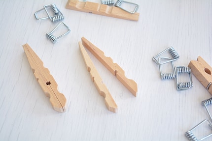 Etape 1: Prenez 12 ou 13 pinces à linge en bois et détachez délicatement les deux pièces individuelles de la pince métallique qui les retient ensemble. Pour cela, il suffit de tourner les deux parties dans des directions opposées l'une à l'autre. Il suffit donc de bricoler un peu pour que l'ensemble se détache assez rapidement.