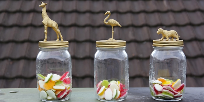 Achetez des bocaux de conserve, une bombe de peinture et des petites figurines d’animaux. Nous avons choisi de réaliser ce projet avec trois bocaux de 1l chacun. Le couvercle de nos bocaux a un diamètre de 86 mm. Nous avons choisi des figurines en fonction de la taille du couvercle. Si vous avez encore de vieux pots de confiture chez vous ou des figurines qui appartenaient à vos enfants, ces derniers font aussi très bien l’affaire.