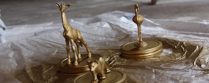 À l’aide de la bombe, peignez le couvercle et la figurine de la couleur de votre choix. Nous avons pris doré. Veillez à répartir la peinture de façon uniforme et n’oubliez pas les endroits difficiles d’accès comme le ventre des animaux. Il est conseillé de travailler avec plusieurs couches fines, jusqu’à obtenir le degré de couverture souhaité. Une fois le couvercle et la figurine peints, laissez-les sécher toute une nuit.