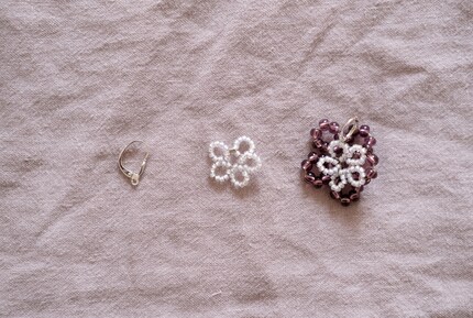 Le premier design est constitué de deux fleurs composées de perles de couleurs et de tailles différentes. Pour la grande fleur, je choisis 7 perles violettes par pétale d'un diamètre de 4,5 mm. Pour la petite, j'utilise 10 perles blanches de 2,2 mm chacune. Les deux fleurs ont un total de 5 pétales.