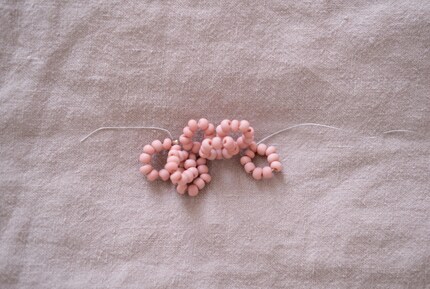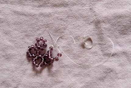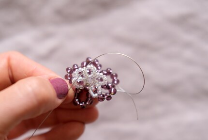 Si vous serrez bien, un cercle de perles rond et creux se formera. Cela représente le premier pétale. Répétez l'opération quatre fois pour obtenir 5 pétales. Une alternative au fil de fer est le fil de nylon, que vous pouvez passer dans les perles à l'aide d'une aiguille. Il est plus maniable et transparent que le fil de fer.