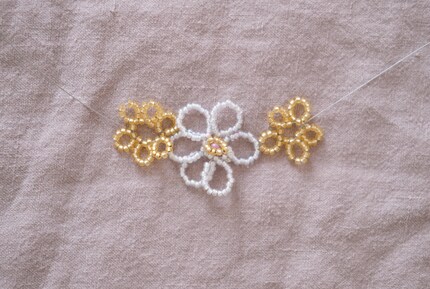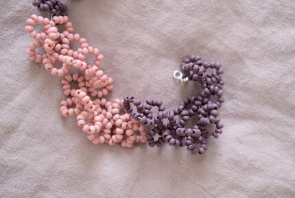 Si vous trouvez cette variante trop fleurie, il existe un deuxième design que vous pouvez réussir avec la même méthode : au lieu de vous arrêter après cinq pétales, continuez. Formez autant de boucles l'une après l'autre jusqu'à ce que vous obteniez une chaîne, en utilisant au moins 60 cm de fil. Si ce n'est pas suffisant, ajoutez un nouveau morceau à l'aide de perles à écraser
