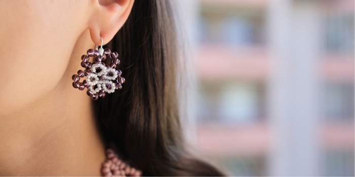 Il n'y a pas de bonne ou de mauvaise façon de choisir le nombre de perles. Si vous voulez des boucles d'oreilles statement, vous allez chercher plus de 7 ou 10 perles par pétale. Comme ces perles sont très légères, leur poids ne vous empêche pas de voir grand. Il en va de même pour les couleurs des perles. Pour créer un contraste et pouvoir facilement associer une tenue, je choisis une teinte sombre et claire : le violet et le blanc. Si vous préférez un design minimaliste, optez plutôt pour un look monochrome. Cela met en valeur la forme sans être trop épais. Les perles et les boucles d'oreilles de mon modèle sont en argent. Mais il existe aussi des variantes en or.