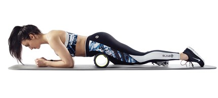 Bras en position d'appui, une jambe pliée, rouleau de massage sous les hanches. Montez et descendez pour masser les muscles fléchisseurs des hanches souvent raccourcis et détendre les fascias. Répétez l'exercice 10 – 15 x par côté.