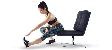 Asseyez-vous au bord de la chaise, tendez une jambe et pliez l'autre, dos droit. Penchez-vous doucement en direction du pied, jusqu'à ressentir une tension dans l'arrière de la cuisse. Tenez 30 – 60 s et changez de jambe.