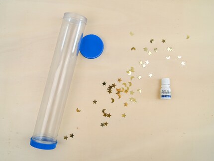 Une fois la bouteille bien fermée par un couvercle, votre enfant peut la retourner, la secouer dans tous les sens et observer avec curiosité le mouvement des corps célestes dans la nuit bleue.