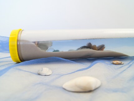Démarrez en remplissant d'abord le fond de sable. Placez-y ensuite les matériaux secs et versez l'eau. Enfin, ajoutez un peu de shampoing dans la bouteille et fermez le couvercle.