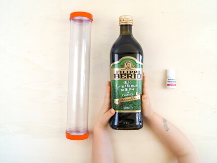 Remplissez la bouteille aux trois quarts avec de l'eau et ajoutez un peu de colorant alimentaire. L'huile vient en dernier dans la bouteille. L'huile étant moins dense, elle ne se mélange pas à l'eau. Lorsqu'on l'agite, la couleur verte ou rouge fait penser à un mélange très toxique.