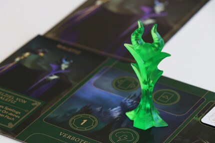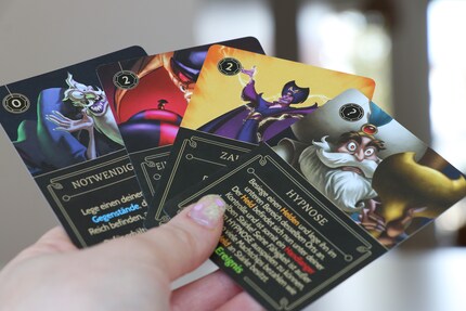 La complexité du jeu est encore davantage renforcée par tout le matériel fourni, en plus des pions et du plateau de jeu. Tous les joueurs ont leur propre plateau de jeu devant eux sur lequel sont représentés différents lieux de l’univers du méchant en question. Par ailleurs, il y a 30 cartes « Méchant » individuelles et un set de cartes « Destin » de 15 cartes pour chaque méchant, un chaudron pour les trois catégories différentes de jetons, des aide-mémoires expliquant les symboles du plateau de jeu et six livrets « Méchant ».