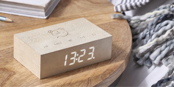 Ces réveils ne sont pas toujours aussi beaux, mais ils sont on ne peut plus clairs. L'affichage numérique vous permet de lire l'heure, même à moitié endormi. Mais, si vous ne pouvez pas baisser la luminosité ou éteindre l'affichage, ces réveils peuvent être à l'origine de grosses frustrations. Côté design, on ne se limite plus au plastique et on peut désormais trouver des boîtiers en bois, métal, mais aussi en plastique. Un Lexon Flip trône sur ma table de nuit et j'en suis très satisfait. Quand je le touche, il s'allume et il me suffit de le retourner pour éteindre l'alarme. Le mot d'ordre est la simplicité, il existe également un modèle qui fait radio-réveil.