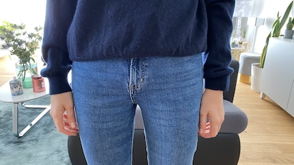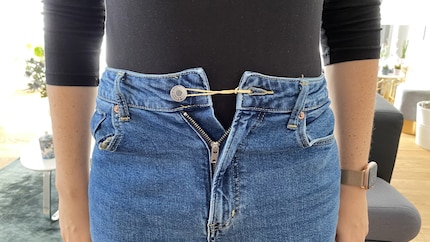 La semaine dernière, j'ai rétréci la ceinture d'un pantalon trop large. Maintenant, c'est au tour de mon deuxième squelette de la garde-robe : un jean qui est serré à force d'être bloqué. Tout ce dont vous avez besoin pour cette astuce mode est un élastique, ou plutôt un élastique de crin. Ce dernier est plus durable et se trouve déjà dans mon panier, car je n'en ai plus. Avant de fermer le pantalon comme d'habitude, je tire l'élastique jusqu'à la moitié de la boutonnière et à travers lui-même. Maintenant, je resserre le tout et je fixe la boucle créée par l'élastique au bouton de mon jean.