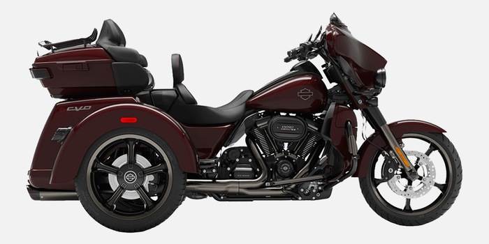 Les modèles restent les mêmes. Mais la CVO Road Glide est une nouveauté. Elle ne vous semble pas familière ? Bien sûr ! Les nouveautés de la gamme ne se limitent pas à la peinture – bronze, olive mate, chrome clair – ni aux nouvelles roues, mais aussi à un système de sonorisation qui diffuse votre musique dans vos oreilles lorsque vous conduisez. La CVO Tri Glide, un trike Milwaukee 117, est habillée d'une couleur scintillante, le rouge « Charred Crimson », comme Harley le nomme.