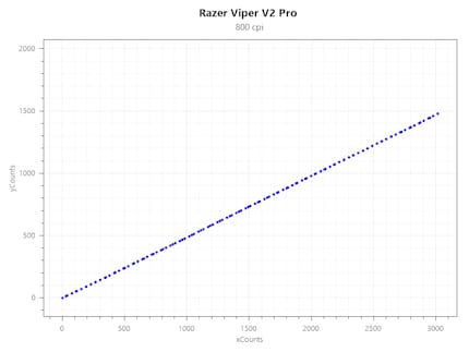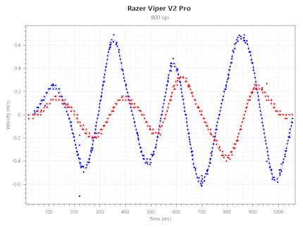 La souris doit reproduire correctement les mouvements rapides. Lors des tests, je déplace rapidement la souris avec différents paramètres de CPI. MouseTester enregistre ces mouvements et affiche un diagramme. Les points sur le diagramme sont les caractères enregistrés. Plus les points sont proches de la ligne, plus la souris enregistre mes mouvements avec précision. Ces derniers doivent être le plus proche possible de la courbe. Les mouvements sur l'axe y sont rouges, ceux sur l'axe x sont bleus.