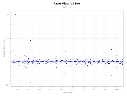 Le polling rate indique l'intervalle auquel la souris envoie des informations au PC. Plus l'intervalle est court, plus les mouvements et les clics peuvent être traités rapidement. Avec un polling rate de 1 000 Hz, le temps de mise à jour est de 1 ms. Autrement dit, la souris envoie des informations au PC mille fois par seconde. Les points sur le graphique indiquent le temps nécessaire à la mise à jour du signal. Plus vous vous rapprochez du polling rate réglé, mieux c'est.