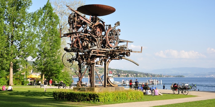 Quand j'étais gamin, tout le monde connaissait Jean Tinguely. Ses machines géantes m'impressionnaient beaucoup. Il y a un nombre incalculable de roues, petites et grandes, qui bougent selon un système compliqué, et de temps en temps, on entend des claquements et des cliquetis. La machine recèle même un piano frappé, de temps à autre, par un marteau en forme de canard.