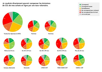 En regardant les réponses, on distingue deux tendances. Tout d'abord, le Röstigraben : les Suisses allemands en particulier souhaitent bénéficier d'une option de compensation des émissions de CO2. En Suisse romande, en revanche, seul un bon cinquième des personnes interrogées ont répondu qu'elles accueilleraient favorablement ou « plutôt favorablement » la possibilité de compenser le CO2 émis lors des achats. Les hommes ont également une opinion plus claire que les femmes en la matière : ils sont plus nombreux à trouver que la compensation est à la fois utile et inutile. La deuxième tendance se dessine au niveau des générations : ce sont principalement les jeunes Suisses de moins de 30 ans et les personnes avec un revenu moyen situé entre 7000 et 12 000 francs par mois qui veulent réduire leur empreinte écologique.