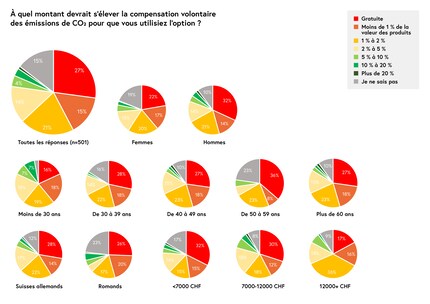 D'ailleurs, les femmes sont beaucoup plus disposées à faire des dons que les hommes. Il en va de même pour les jeunes Suisses : parmi les moins de 30 ans, plus des deux tiers seraient prêts à payer une compensation environnementale. Sept pour cent d'entre eux seraient même prêts à payer entre 10 et 20 % de la valeur des produits, et un pour cent encore plus. Les 50-59 ans sont les plus près de leurs sous : plus d'un tiers des personnes interrogées considèrent que la réduction de leur empreinte CO2 n'a aucune valeur. Les personnes à haut revenu sont généreuses : plus de la moitié des personnes gagnant plus de 12 000 francs par mois donneraient plus d'un pour cent de la valeur de leurs biens à la compensation environnementale.