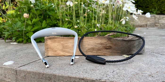 Le premier modèle est pour les femmes, le deuxième pour les hommes. En tout cas, c’est ainsi qu’ils sont présentés. La version « homme » se présente sous la forme d’un collier façon cuir tressé, genre surfeur californien. La fermeture est magnétique, l’ioniseur en plastique noir n’est certes pas aussi décoratif qu’une dent de requin, mais il n’est pas non plus hideux.