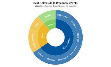 Les trois best-sellers par catégorie de produits montrent ce qui a été particulièrement populaire en Suisse romande en 2020. En bref, en 2020 nous avons été occupés à changer des couches, désinfecter, imprimer, brancher, aimer, nettoyer, câbler, offrir, jouer, faire du vélo, nourrir (plus de chats que de chiens, d'ailleurs), regarder l'heure et éclairer leur quotidien.