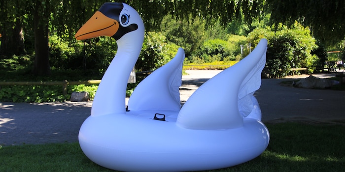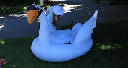 Lorsque nous en avons eu assez de l'eau, je me suis demandé comment nous allions pouvoir sortir le cygne de l'eau sans frapper l'un des baigneurs avec l'une de ses ailes. Mais à quoi bon avoir un homme à ses côtés ? Il n'y a pas eu beaucoup de discussions. Ma moitié a simplement retourné le cygne et l'a sorti de l'eau la tête en bas. Un petit conseil de sécurité ici : vérifiez d'abord que personne n'est assis sur le cygne.