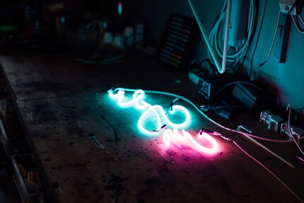 Cependant, le néon lui-même n'est pas rose, mais rougeâtre en se déchargeant. Mélangé avec de l'argon, le tube devient bleu. Pour obtenir encore plus de couleurs, Christian a également recours à des verres filtrants. « C'est du vrai verre de Murano. » Sinon, il utilise également du plexiglas et des verres sans plomb. « Par le passé, le verre au plomb était presque le seul matériau utilisé, mais pour des raisons de protection sanitaire, il n'est plus utilisé. » Aujourd'hui, il s'approvisionne en tubes de verre principalement dans le nord de l'Italie. En Suisse, tous les fabricants ont dû fermer leurs portes en raison de la crise de la DEL. Les besoins en verre dépendent de la présence de souffleurs de verre néon. En Italie aussi, seules les entreprises innovantes ont survécu.
