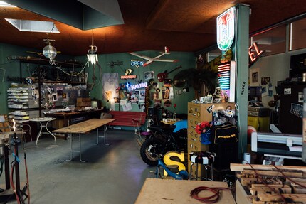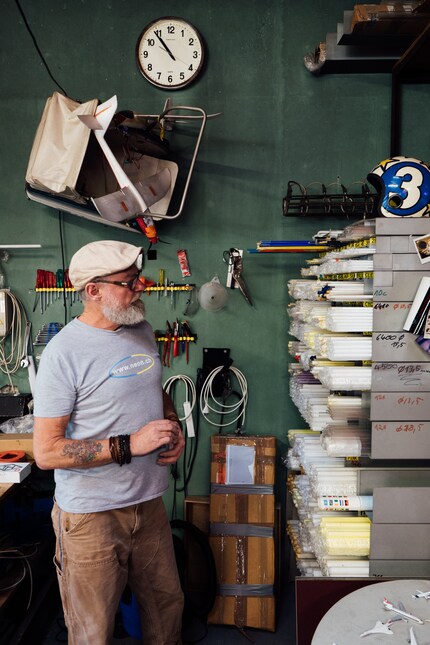 Tout afficherAssis devant l'écran d'ordinateur de son atelier, Christian conçoit une nouvelle enseigne publicitaire lumineuse. Sa casquette beige plate s'harmonise avec son pantalon cargo retroussé, son t-shirt gris et sa barbe fournie. À côté de lui trône un grand traceur au-dessus duquel est accrochée une vieille affiche arborant toutes sortes de polices de caractères. Il s'agit du coin le plus ordinaire de cette grande pièce ornée d'une boule disco, d'un palmier en plastique, de deux motos, d'un banc de jardin rouge et d'une grande maquette d'avion suspendue au plafond. Des dizaines d'autres modèles réduits d'avions de ligne occupent une table de bistrot. Les murs verts sont rythmés par des affiches de concerts, photos, guirlandes et néons bien sûr. L'atelier ressemble à une boîte de conserve surdimensionnée en raison de l'atmosphère artistique typique de cet ancien site métallurgique de Selve.