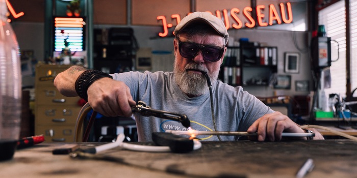Depuis 30 ans, la passion est toujours la même, seule la productivité a augmenté. Dès qu'il commence à souffler du verre, Christian est concentré. Son visage devient sérieux, ses yeux s'accrochent au tube de verre qu'il tient dans la main. Un embout en forme de sifflet, relié au verre par un tube, pend au coin de sa bouche. On entend uniquement les flammes qui jaillissent de l'ouverture métallique tels les feux d'artifice un soir du Nouvel An. Christian tourne le tube d'avant en arrière de façon continue, mais sans précipitation. Il connaît la matière sur le bout des doigts. Il sait quand le verre est suffisamment chaud pour le retirer de la flamme afin de le façonner rapidement. Il sait avec quelle force il faut souffler dans l'embout pour maintenir le diamètre du tube.