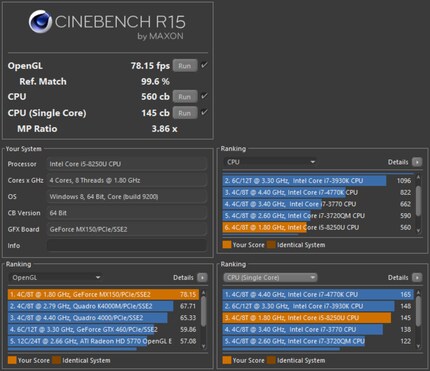 Résultats obtenus pour le notebook avec Cinebench R15 :