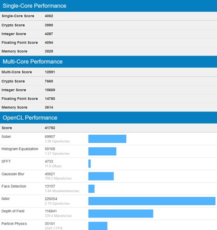 Geekbench 4 est un benchmark multiplateforme. Il fonctionne pour Windows, MacOS, Linux, Android et iOS. Avec la version 4 du test de performances CPU, la valeur de base de 4000 points reflète les performances d’un Intel Core i7 6600U cadencé à 2,60 GHz. En plus de scénarios réels simulés, utilisés pour tester les CPU (single core et multi core), Geekbench peut aussi déterminer les performances GPU dans les domaines du traitement d'image et de la vision par ordinateur. Vous pouvez aussi comparer les résultats avec d’autres systèmes en utilisant le navigateur Geekbench.