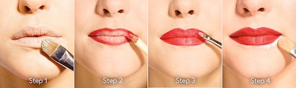 Que ce soit au pinceau ou directement avec le rouge à lèvres, badigeonnez vos lèvres de couleur sans oublier les commissures des lèvres.