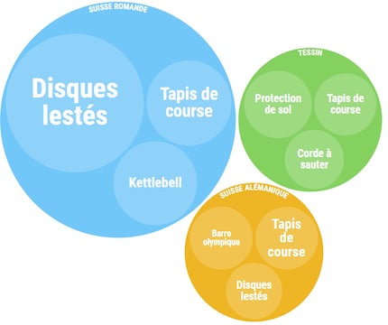 Quels sont les équipements particulièrement appréciés des ménages suisses ? En janvier dernier, ce sont les tapis de yoga et les bandes élastiques qui atterrissent le plus souvent dans le panier d'achats virtuel, et ce, quelle que soit la région du pays. La demande de matériel plus lourd connait une hausse flagrante : en Suisse alémanique, les barres olympiques sont fortement plébiscitées, tandis qu'en Suisse romande, ce sont les disques lestés – c'est-à-dire les poids allant avec la barre olympique – qui sont les plus vendus.