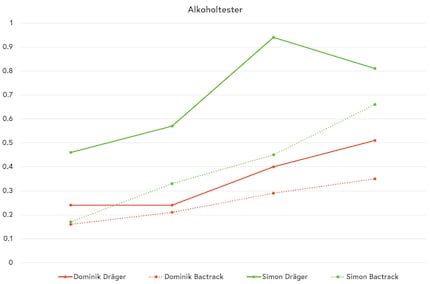 J'avais constamment plus d'alcool dans le sang que Dominik, bien que nous ayons à peu près le même poids et que, selon la croyance populaire, nous devrions avoir le même taux d'alcool dans le sang. Quelle en est la raison ? Une explication possible est que Dominik a bu plus vite que moi. Il a donc eu plus de temps pour "digérer" et j'avais plutôt encore des vapeurs d'alcool dans la bouche.