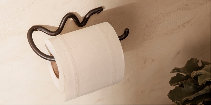 L'aspect artisanal du crochet en laiton « Curvature » de Ferm Living lui confère un caractère sculptural. Par contre, dès qu'un rouleau de papier toilette y est accroché, c'en est fini. Il n'a certes rien d'ancien, mais sa forme organique le distingue de la plupart de ses homologues en acier chromé. Il pourrait même donner à votre salle de bain le statut de salle d'exposition.