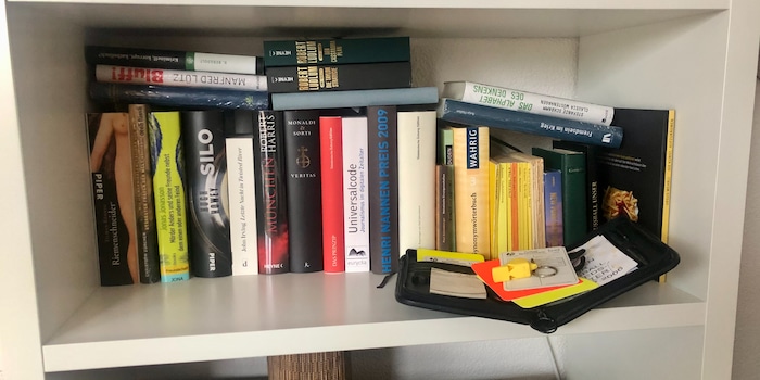 Depuis la fin de mes études, j'ai pu prendre des décisions littéraires plus indépendantes en ajoutant à ma collection des œuvres de fiction d'auteurs de renom comme John Irving (« Last Night in Twisted River » – « Dernière nuit à Twisted River »), Ken Follet (« La Chute des géants » – « Fall of Giants »), Robert Harris (« Munich ») et Florian Illies (« 1913 »), sur un pied d'égalité avec les témoins de ma consommation actuelle de livres, des thrillers dont les personnages principaux sont des agents et/ou des politiciens.