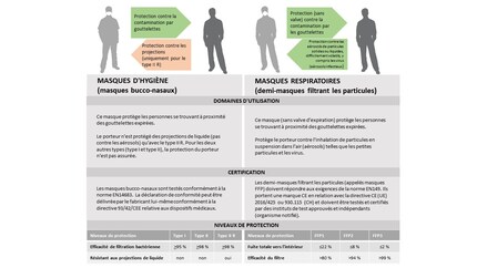 L'incertitude liée aux masques de protection est au moins aussi grande que la demande : quel masque me protégera du virus ? Lequel protégera mes semblables ? Et que penser des niveaux de protection ? Il existe de nombreuses informations à ce sujet sur Internet, mais souvent elles ne sont ni à jour ni pertinentes. En principe, on dénombre trois types de masques : les masques d'hygiène, les masques respiratoires et les masques faits maison. Dans le jargon technique, les masques respiratoires sont aussi appelés « demi-masques filtrant les particules », les masques d'hygiène, « masques bucco-nasaux » et les masques faits maison, « masques communautaires ». L'illustration suivante montre les caractéristiques générales des différents types de masques. Ici, vous trouverez un article détaillé sur le sujet.