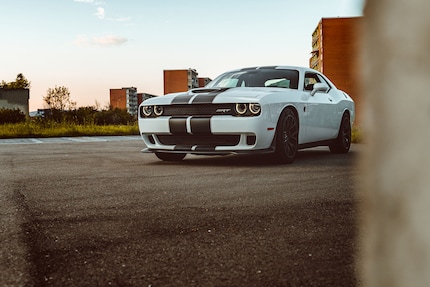 La Dodge Challenger Hellcat, blanche avec des bandes iconiques noires sur le capot. Les fans de voitures auront la larmichette au plus tard maintenant, car la Hellcat est une voiture de rêve. Avec 717 chevaux, la coupée est probablement la voiture la plus puissante sur les routes suisses.