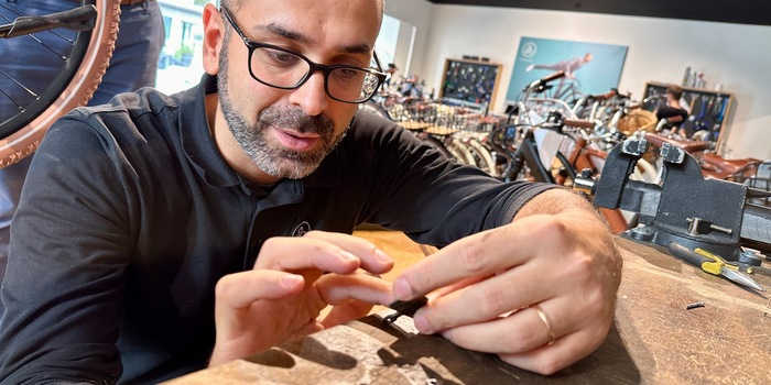 Non seulement je n’aime pas nettoyer les vélos, mais je n’y bricole rien moi-même non plus. Mes connaissances sur les pièces et les fonctions d’un vélo sont purement théoriques. La dernière fois que j’ai utilisé mon vélo électrique, j’ai tout de même remarqué qu’il y avait un problème avec le frein arrière. Il ne freinait plus correctement. Et effectivement, Tommaso confirme que les plaquettes de frein doivent être changées. Je lui demande si, après 750 kilomètres, ce n’est pas un peu tôt. En raison de leur poids et de leur vitesse plus élevés, les vélos électriques sont équipés de plaquettes de frein plus stables. C’est vrai en théorie, dit l’expert, mais si l’utilisateur, c’est-à-dire moi, freine mal, les plaquettes s’usent plus vite.