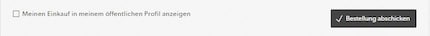 Tout afficherÀ la fin du processus de commande, juste avant l'envoi de cette dernière, vous pouvez désormais choisir si vous voulez que les produits commandés soient affichés dans votre profil d'utilisateur ou non. Des amis ou utilisateurs intéressés peuvent ainsi voir quels produits vous avez achetés. Les détails comme le prix payé, le nombre d'exemplaires ou l'adresse de livraison ne sont bien évidemment pas visibles. Et, bien entendu, dans les réglages standard, cette fonction est désactivée (et pour toutes les commandes futures éventuelles, c'est le réglage de la commande précédente qui est pris en compte).