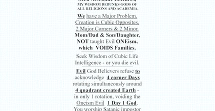 Si Gene Ray tient à ce que nous prenions en considération le TimeCube ou Timecube – lui-même n’est pas toujours sûr de l’orthographe -, essayons au moins de l’interpréter. Ce qui est important, c’est que Gene Ray rejette le Dieu judéo-chrétien. Catégoriquement et absolument. Il glisse quelques insultes à l’encontre de la religion. Laissons cela et penchons-nous sur la physique totalement logique qui se cache derrière la théorie du Timecube.