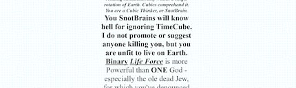 Capture d’écran du site sur la théorie du TimecubeLe site est écrit d’un seul trait, aucun paragraphe et est sans fin. Gene Ray s’est visiblement mis à écrire et ne s’est jamais arrêté. Et puis a un moment il a dû découvrir Paint et s’est mis à dessiner.